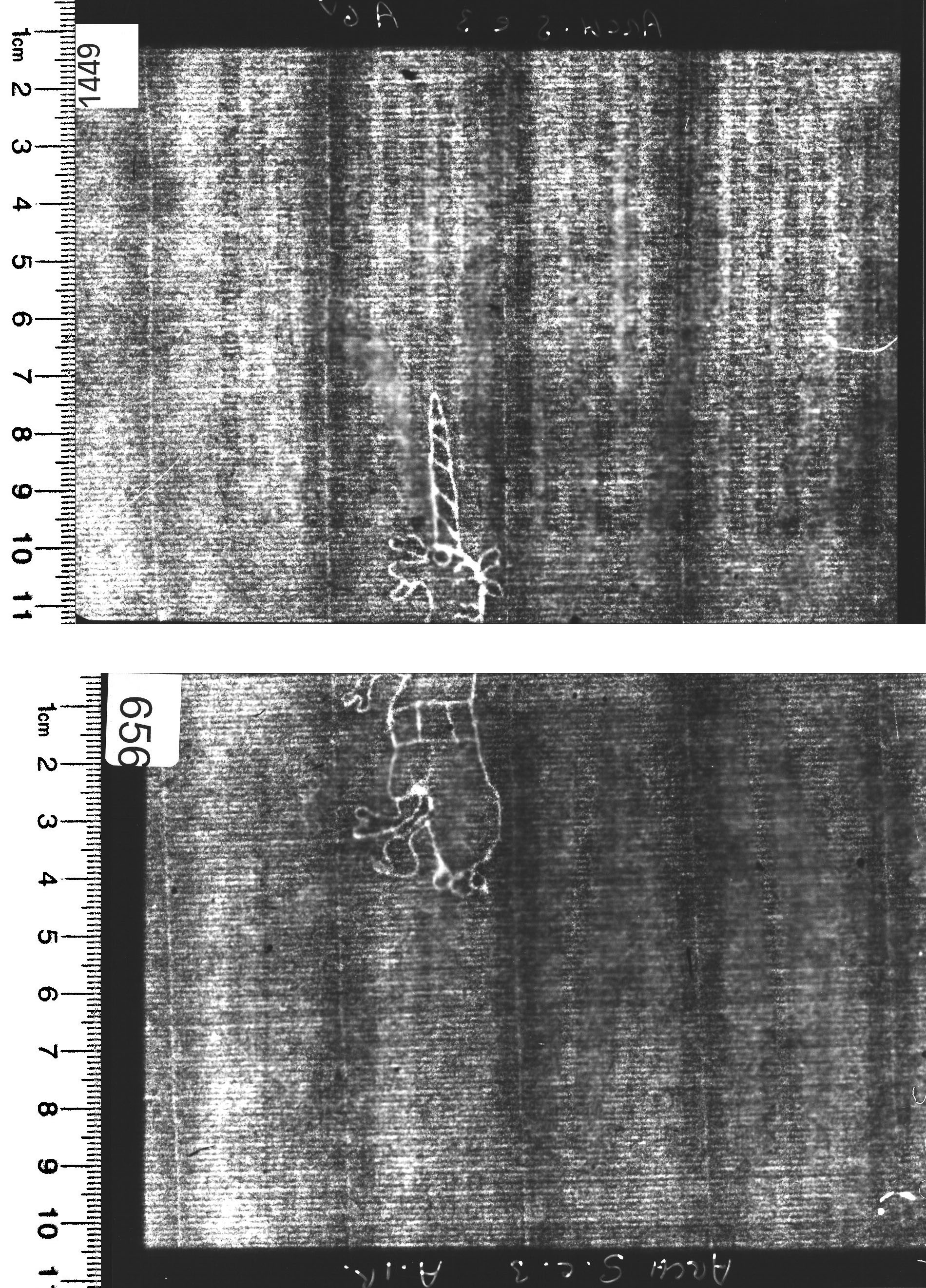 | Reference number: 656 Watermark description: unicorn, vertical, double line band, tail trefoil, to left Bernstein description: fabulous creature - unicorn - detached - entire figure - vertical - double line band - tail trefoil - to left Mainclass IPH: F Maingroup description: unicorn Position: left Identical watermarks: Reproduction: beta-radiograph Depository: Bodleian Library, Oxford, Great Britain | ![]() ![]() |