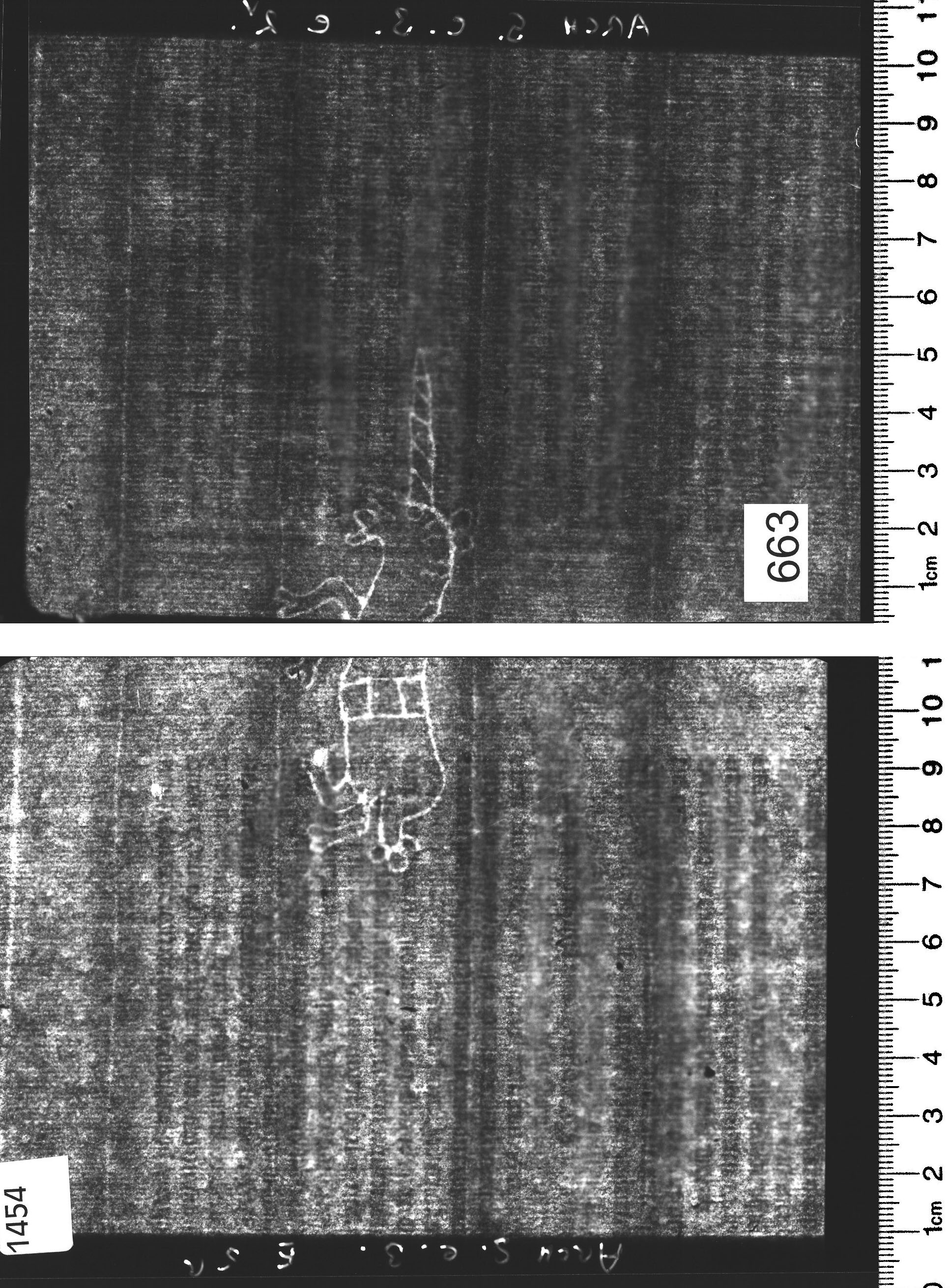 | Reference number: 663 Watermark description: unicorn, vertical, double line band, tail trefoil, to left Bernstein description: fabulous creature - unicorn - detached - entire figure - vertical - double line band - tail trefoil - to left Mainclass IPH: F Maingroup description: unicorn Position: left Identical watermarks: Reproduction: beta-radiograph Depository: Bodleian Library, Oxford, Great Britain | ![]() ![]() |
