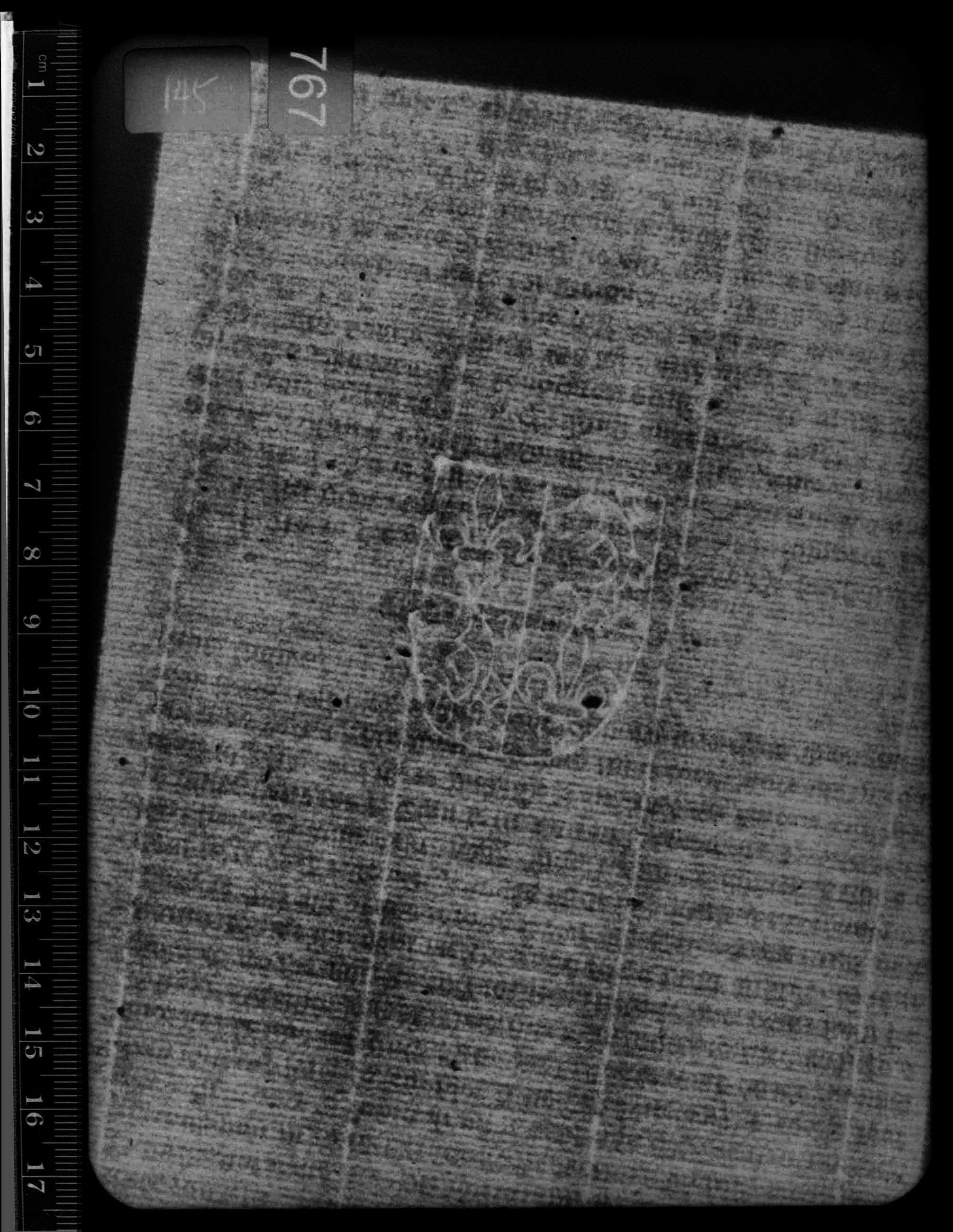 | Reference number: 767 Watermark description: shield, two lilies, two dolphins (Dauphin) Bernstein description: coat of arms - family crest - shield - two lilies - two dolphins (Dauphin) Mainclass IPH: T Maingroup description: shield Position: left Identical watermarks: BMC XI 419: Caxton 114; BMC XI 420: Caxton 140, 142, 145, 146, 147, 148, 154; BMC XI 421: Caxton 158, 159, 160, 161, 162, 163, 164, 165, 166, 167, 168, 169, 170, 171, 172,173, 174, 175, 176, 177, 178, 179, 180, 181 Reproduction: beta-radiograph Depository: Pierpont Morgan Library, New York, U.S.A. | ![]() ![]() |