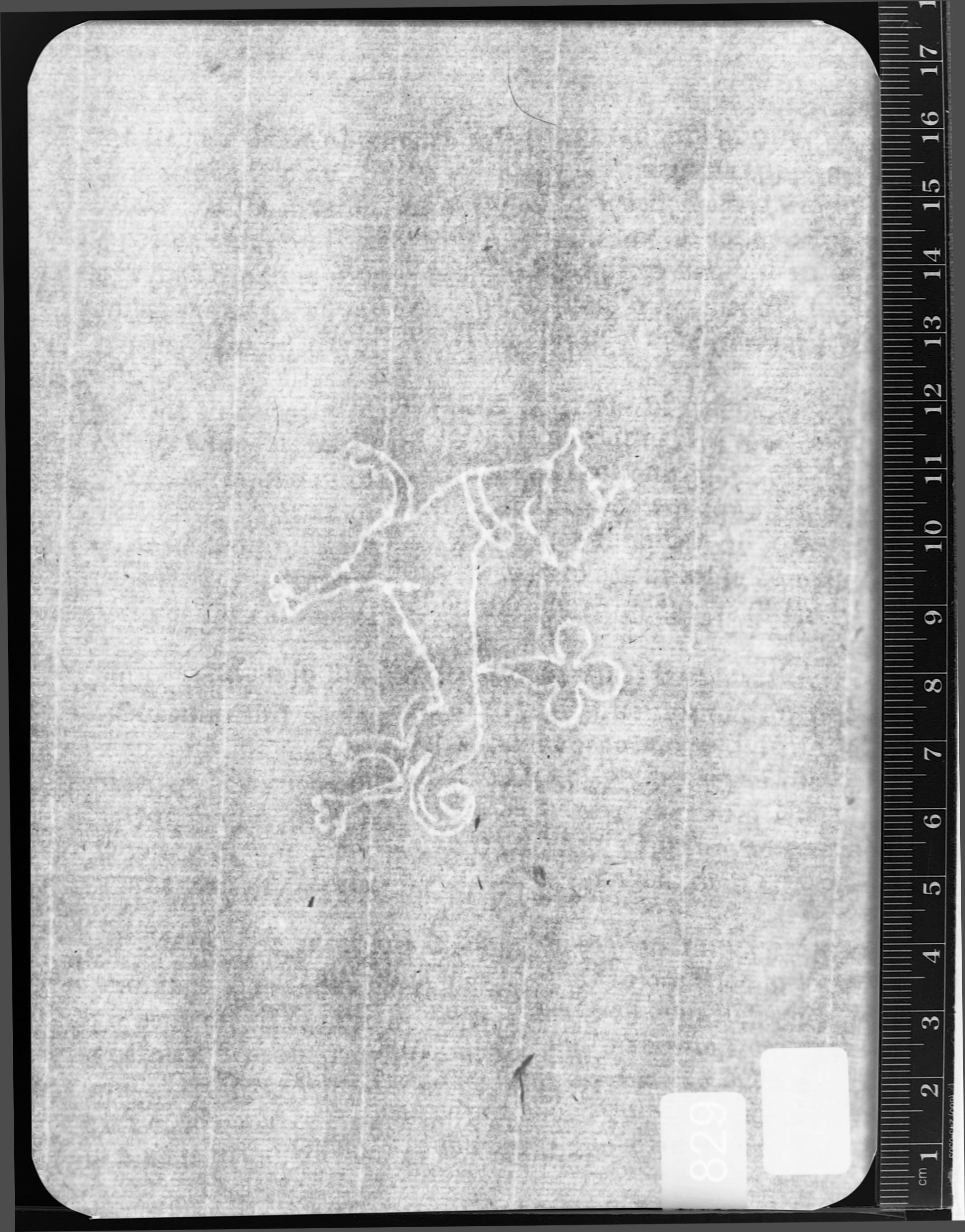 | Reference number: 829 Watermark description: dog, quatrefoil, double line tail, looking backwards, to left Bernstein description: fauna - tetrapod - dog - quatrefoil - double line tail - looking backwards - to left Mainclass IPH: C Maingroup description: dog Position: right Identical watermarks: BMC XI 420: Caxton 134, 135, 136, 137, 139, 140, 141, 143 Reproduction: beta-radiograph Depository: Pierpont Morgan Library, New York, U.S.A. | ![]() ![]() |